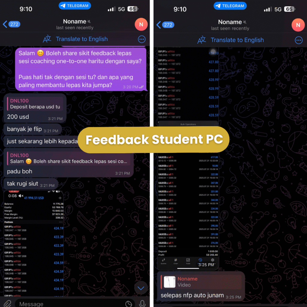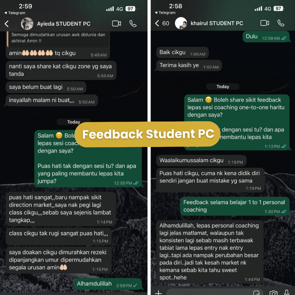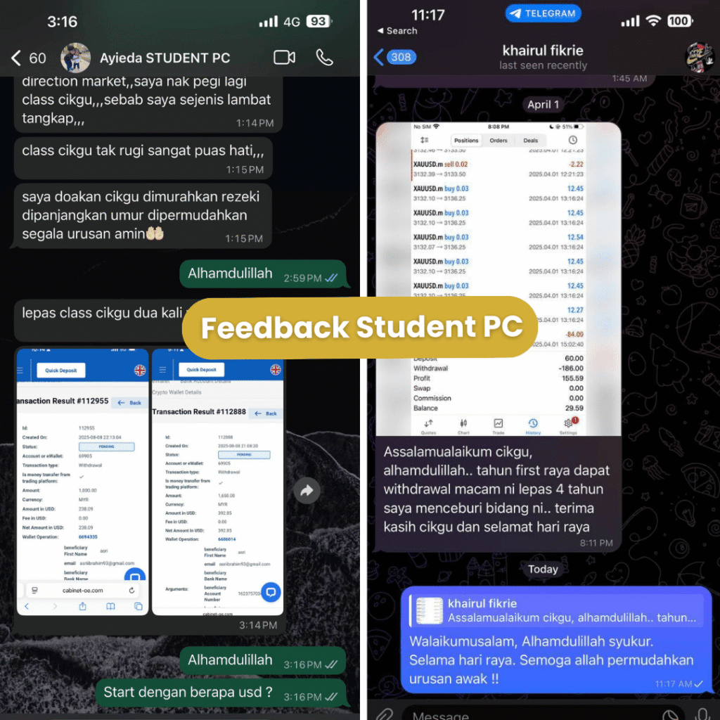 “Sebelum ni saya trade ikut rasa… kadang profit, kadang MC. Tapi lepas sesi 1-to-1 coaching dengan cikgu, saya terus nampak jelas macam mana nak baca market & setup yang betul. Sesi ni bukan sekadar teori — cikgu terus tunjuk live market, siap guide step-by-step ikut kelemahan saya. Memang puas hati, rasa berbaloi setiap sen.”
